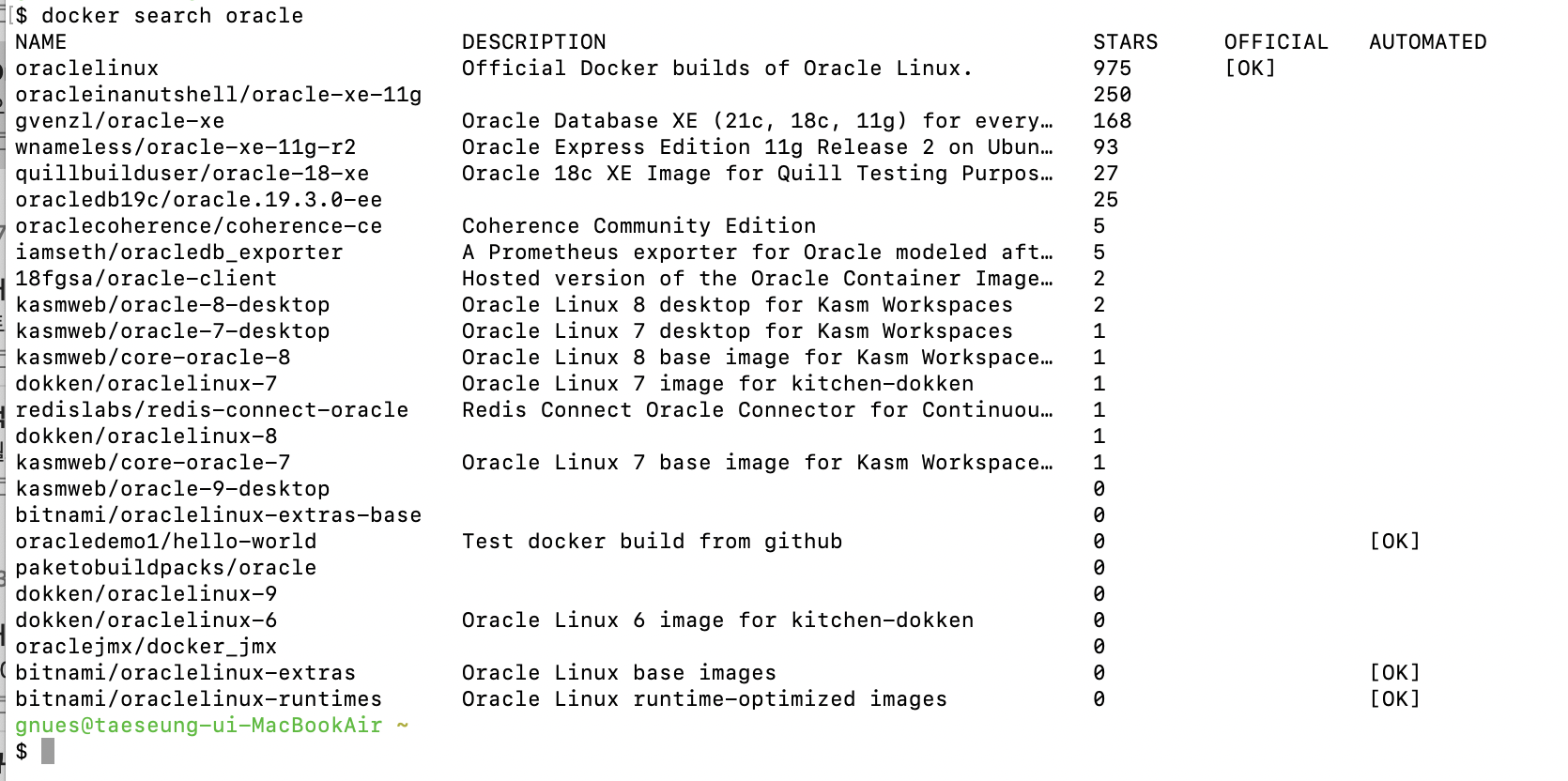 위 과정까지 따라 왔으면 docker를 설치가 됐을 것이다. 그러면 `docker search oracle` 를 입력하고 원하는 버젼의 오라클을 설치한다. 나는 gvenzl/oracle-xe를 설치해보겠다. 설치는 다음의 명령어를 입력한다.(하나씩 순서대로)