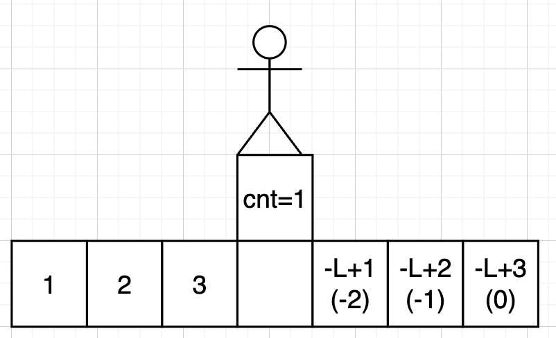 여기가 조금 헷갈릴텐데, cnt를 -L+1로 설정하는 것이다. 그리고 처음 얘기한 로직대로 같은 높이의 칸을 만나면 계속 +1이 될 것이다.