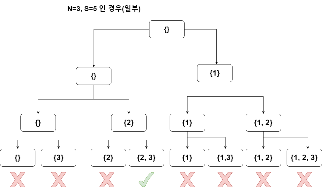 최종적으로 나오는 수열은 { }. (공집합) 따라서 합이 S=5 가 되지 않으므로 해당 부분수열은 세지 않는다.
